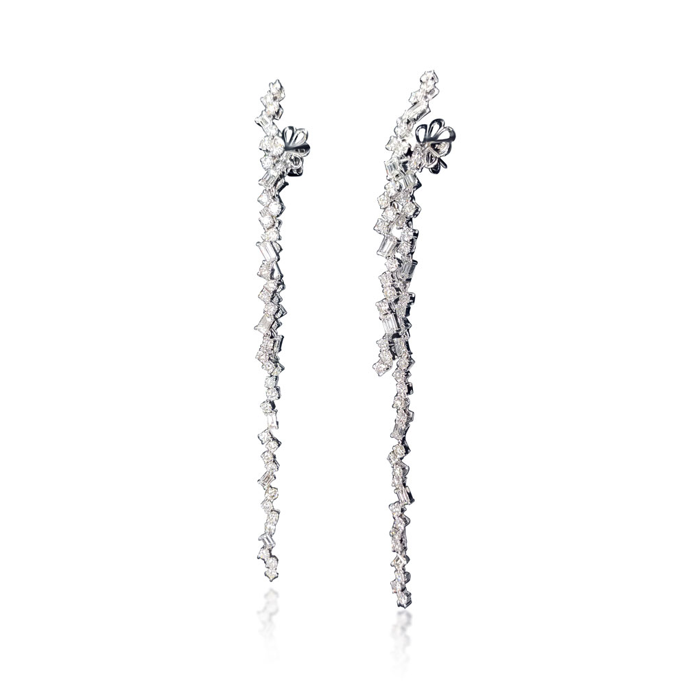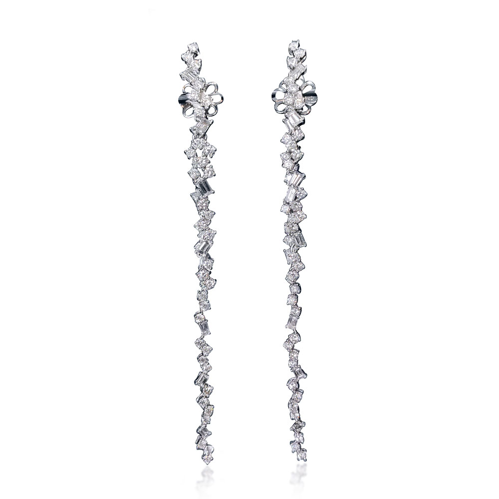 Something so alluring, something so smooth, yet it worn by one so sure of their style. The Wisteria Earrings are our love song to the grandeur of wisteria in bloom. Following the movement of the flowers, the combination of round and baguette diamonds are set in white gold to evoke the beauty of the plant.